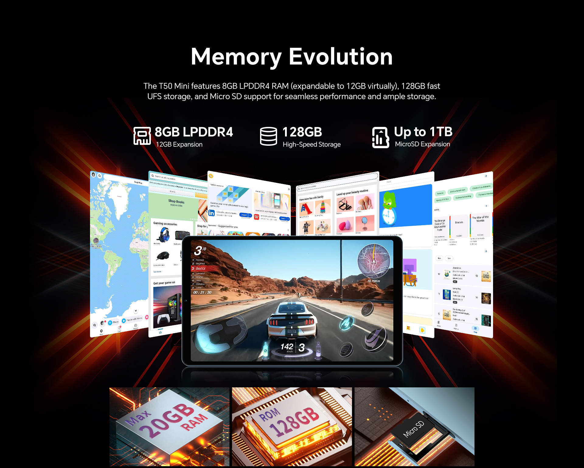 [Powerful Performance] Powered by the MTK Helio G99 Octa-core processor and up to 20GB RAM, the T50 Mini ensures fast, smooth multitasking and ample storage with 128GB UFS.