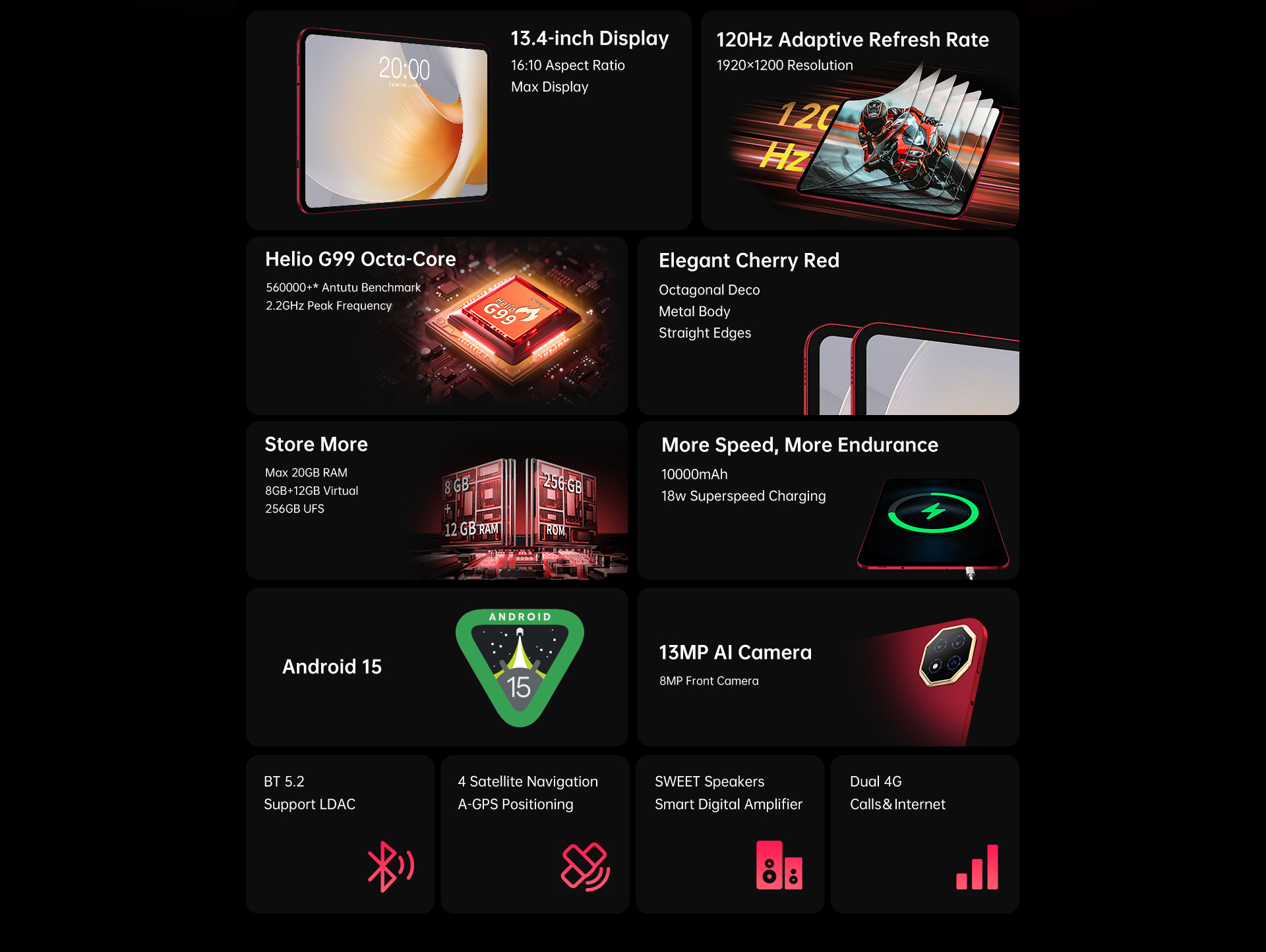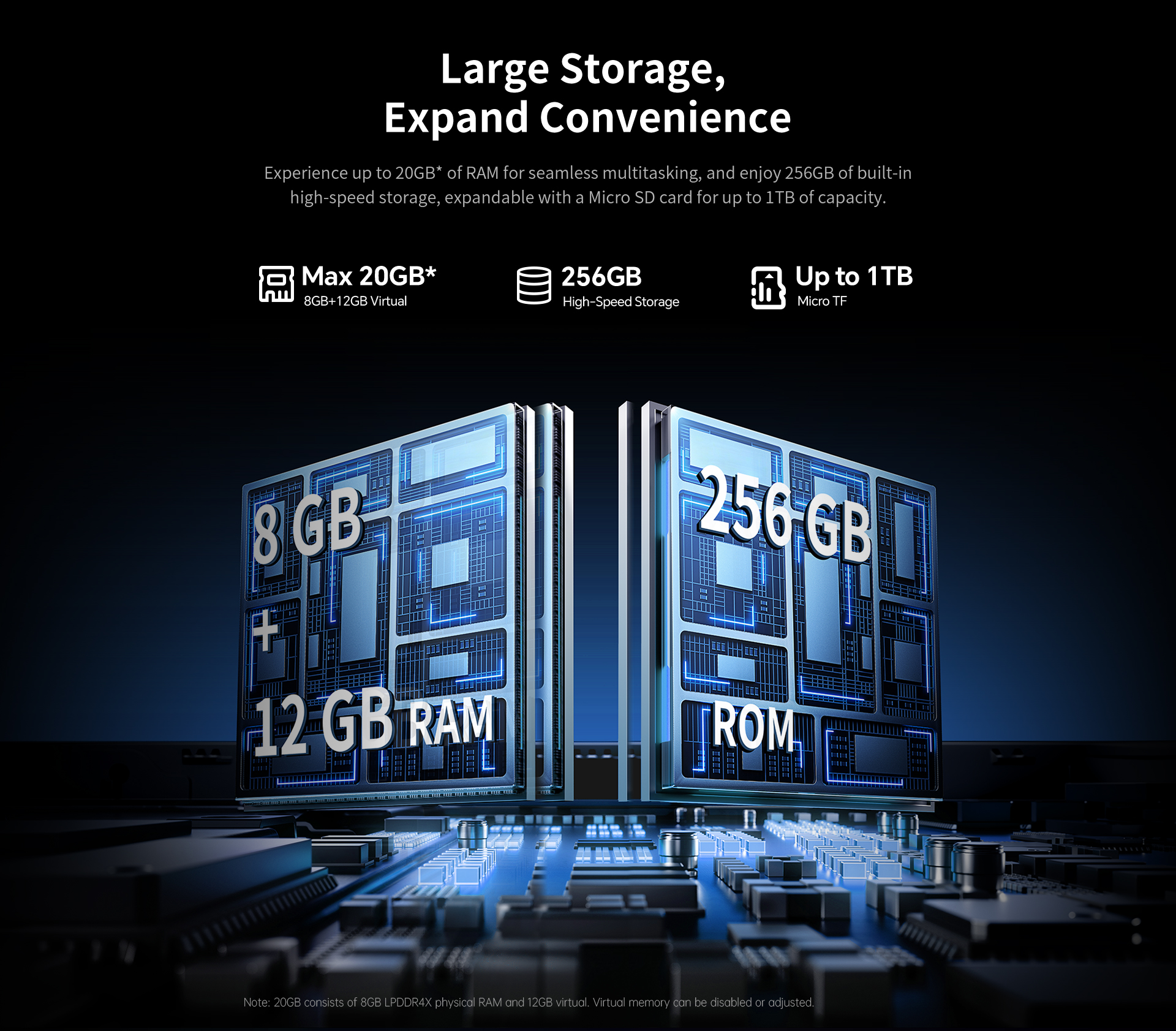 [Helio G99 Performance] Powered by Helio G99 CPU with up to 20GB RAM (8+12GB) and 256GB UFS storage, expandable to 1TB, the T65 Plus handles multitasking and demanding apps effortlessly.