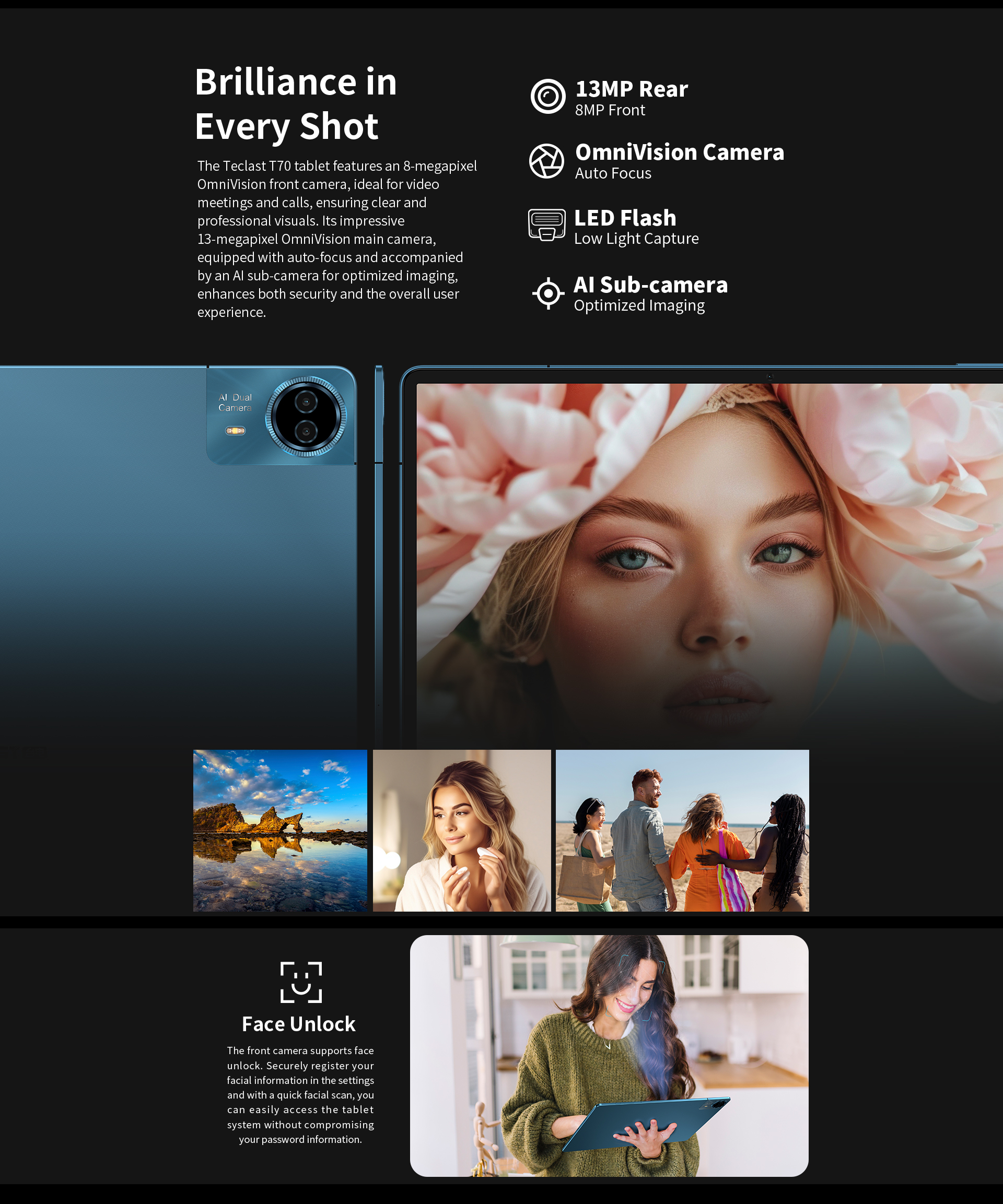 [Capture Perfection] Capture the essence of perfection with the T70's advanced 13MP rear autofocus camera and a refined 8MP front camera. These high-fidelity cameras deliver stunningly clear images and seamless video calls, encapsulating the essence of flagship photography.