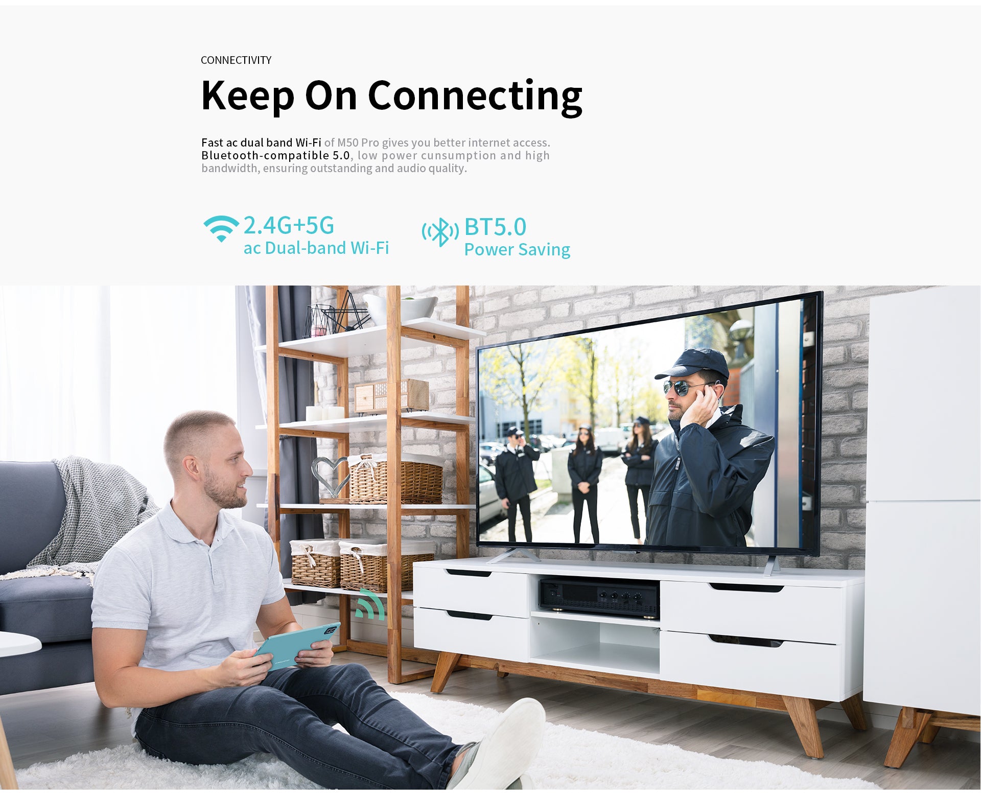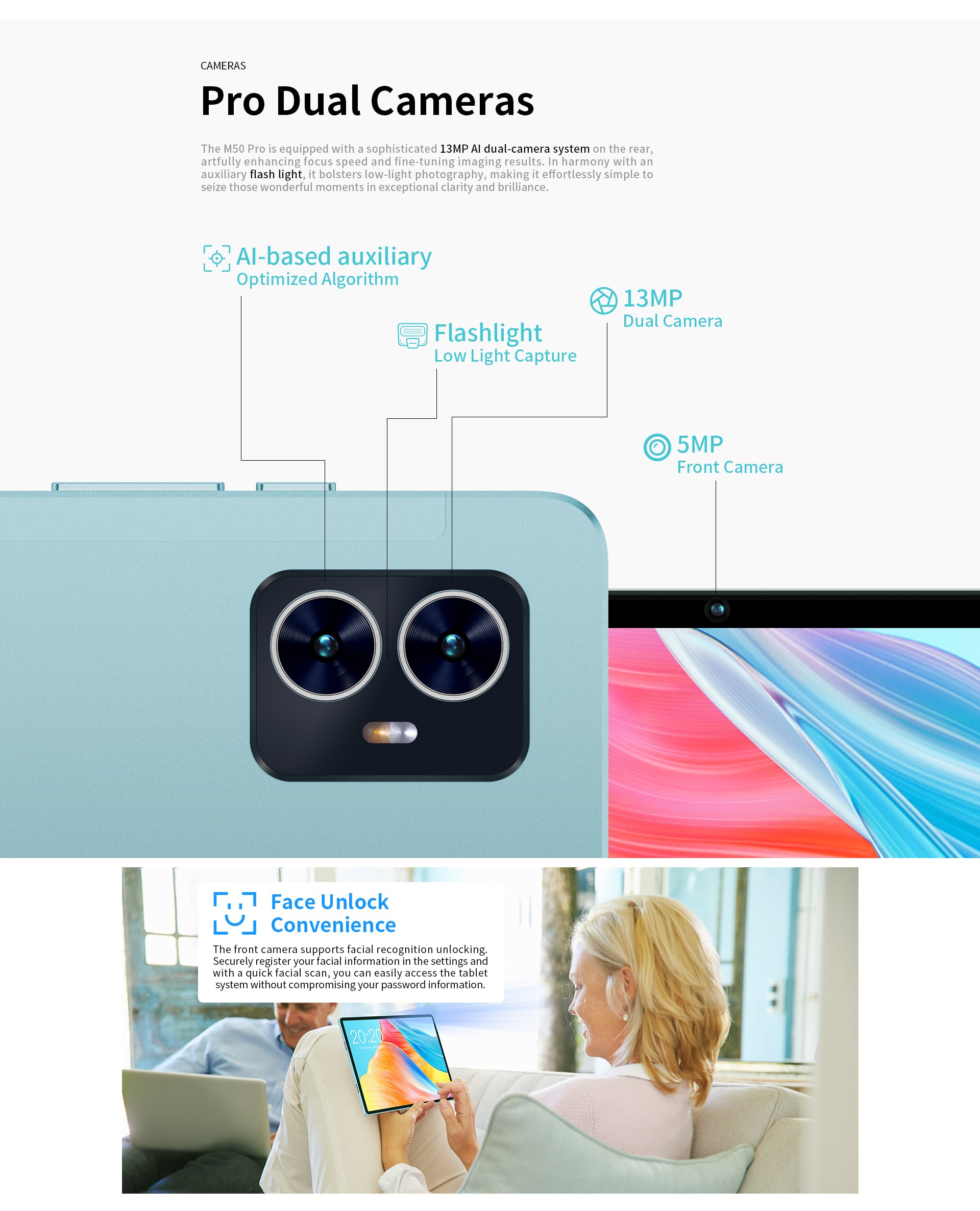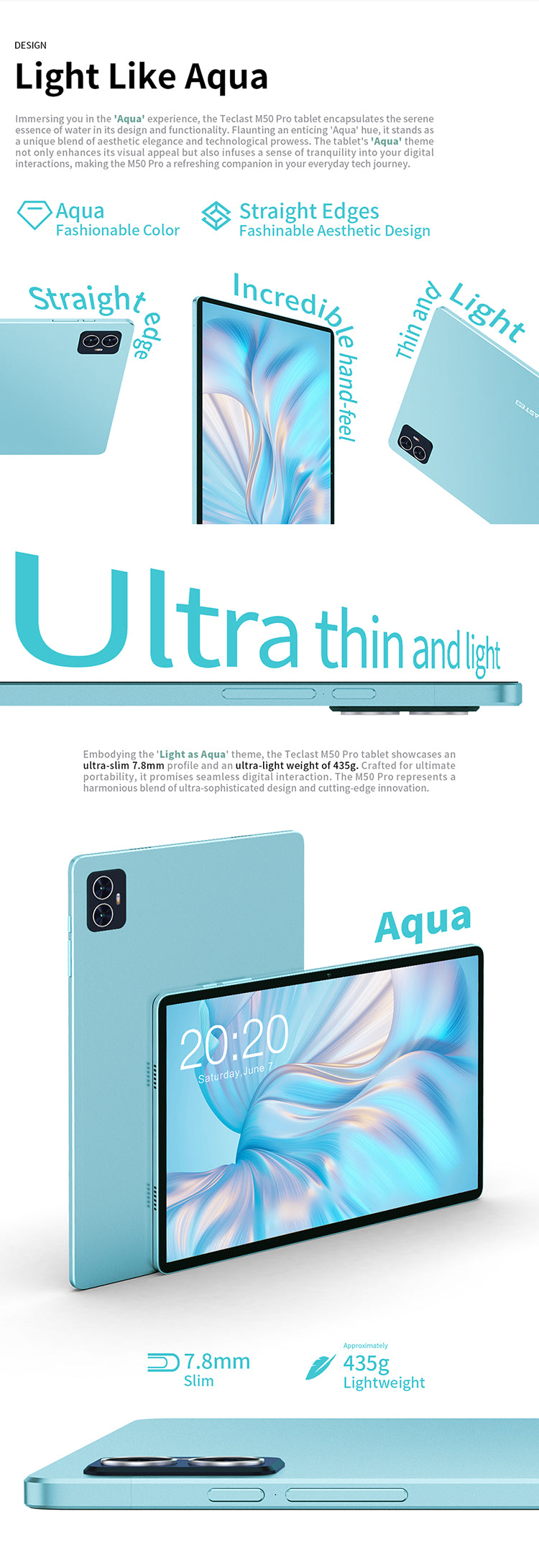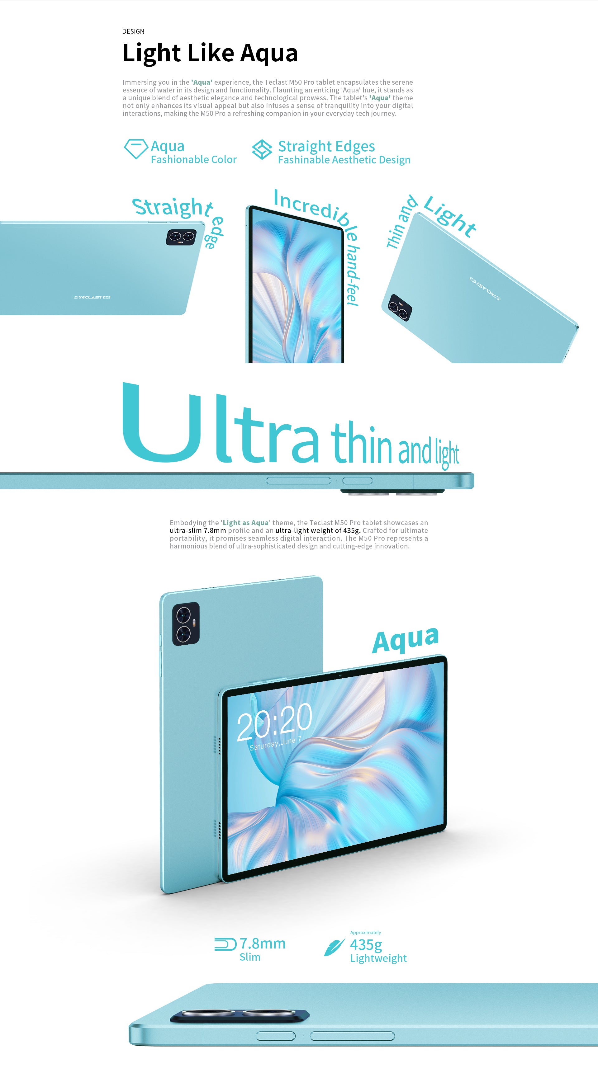 [Aqua Slim Design] M50 Pro โดดเด่นด้วยตัวเครื่องสี 'Aqua' ที่บางเพียง 7.8 มม. และหนักเพียง 435 กรัม การออกแบบที่บางและน้ำหนักเบาทำให้ง่ายต่อการพกพา คุณจึงมั่นใจได้ว่าจะทำงานหรือเล่นได้ทุกที่