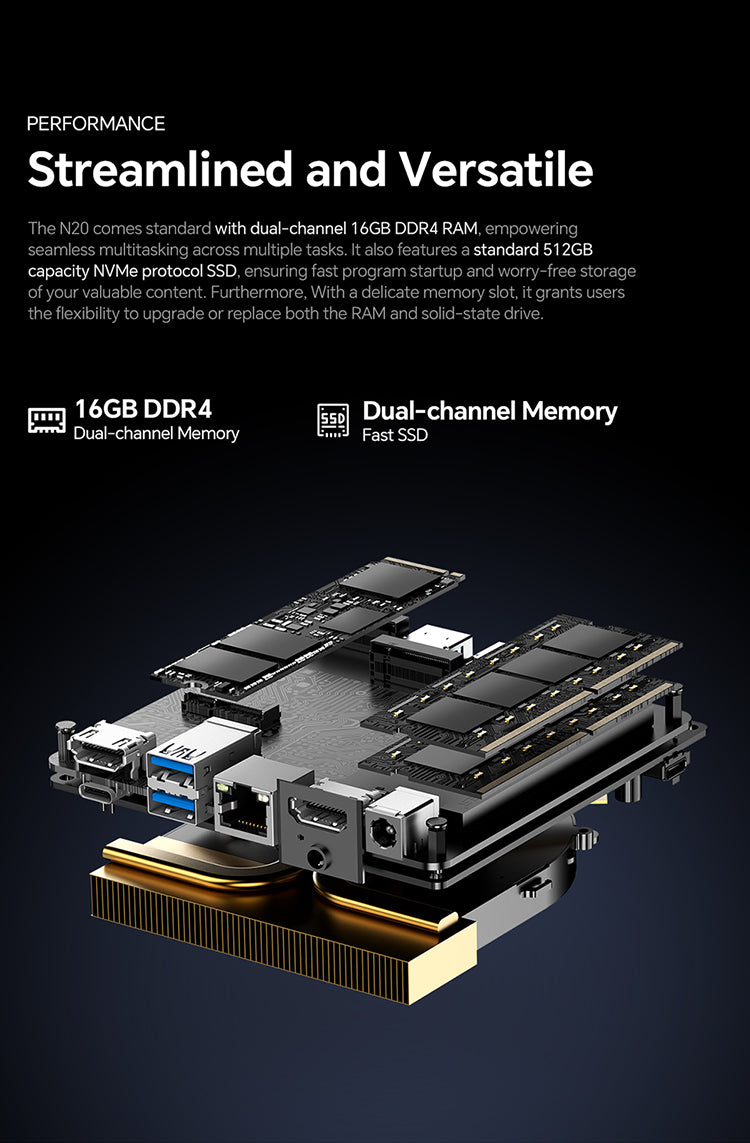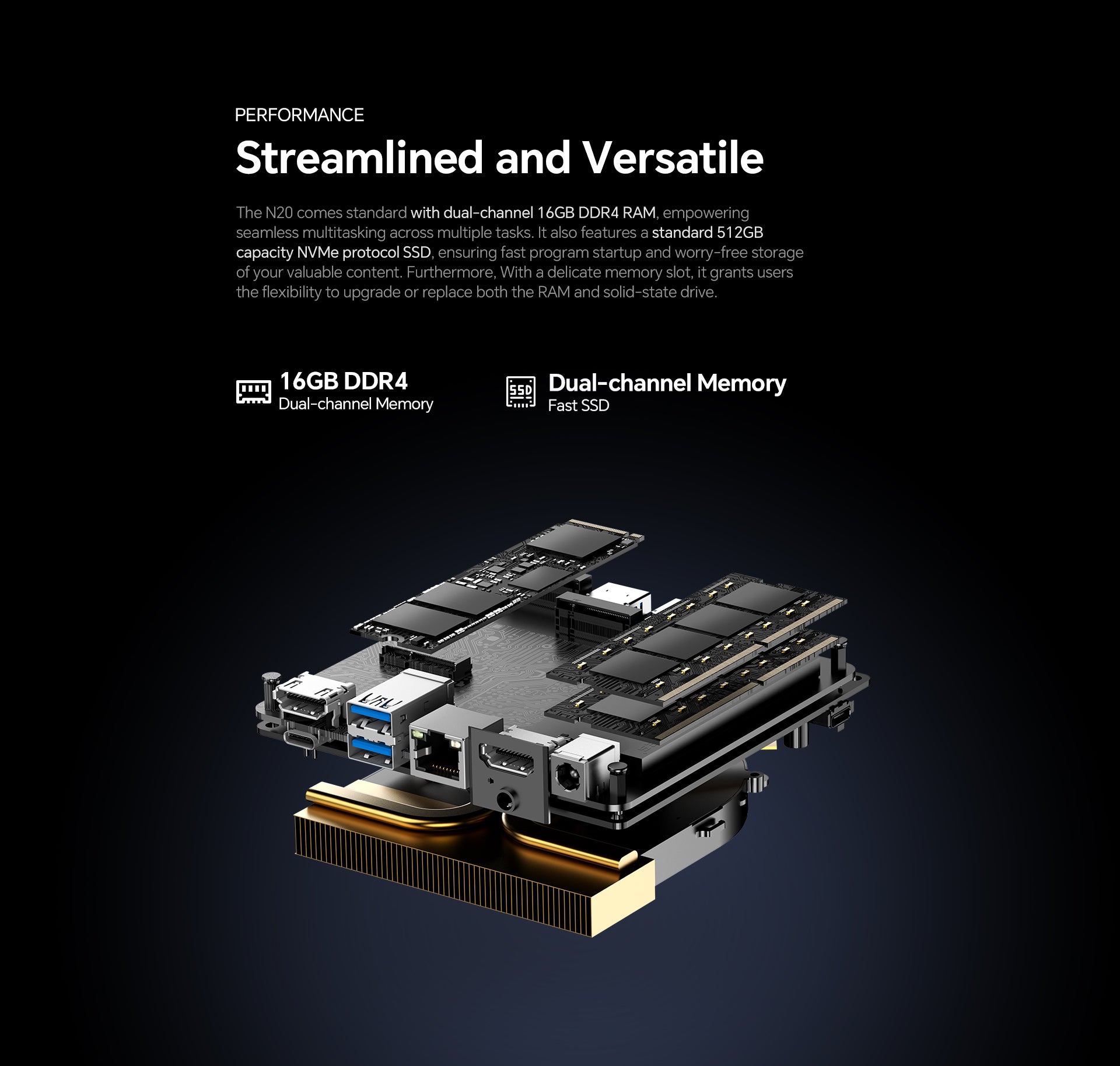 [พื้นที่จัดเก็บข้อมูลที่ขยายได้] ด้วย RAM DDR4 ขนาด 16GB และ NVMe SSD ขนาด 512GB ทำให้ N20 มอบพื้นที่จัดเก็บข้อมูลความเร็วสูง อัปเกรดได้เพื่อประสิทธิภาพที่ดียิ่งขึ้น