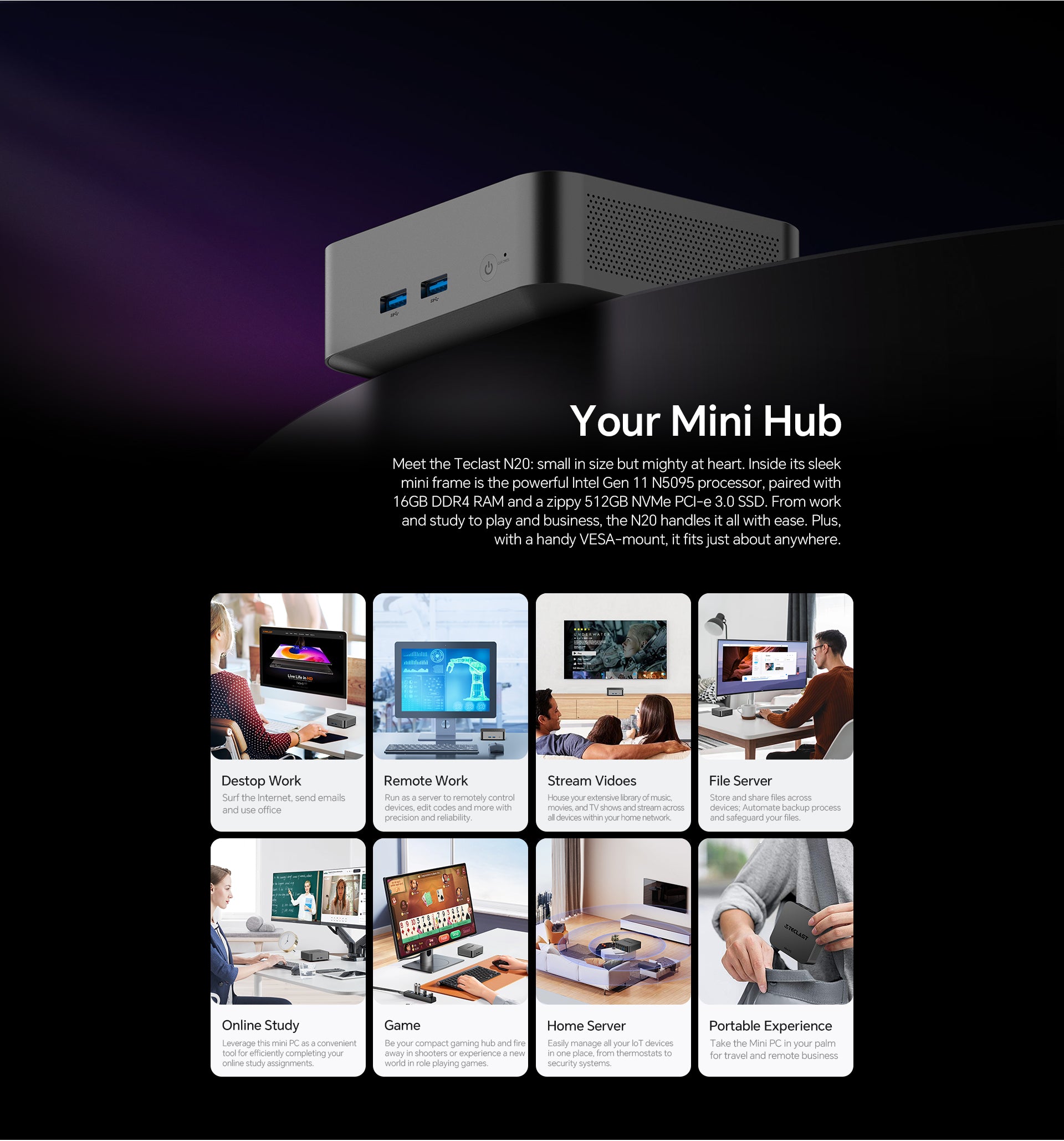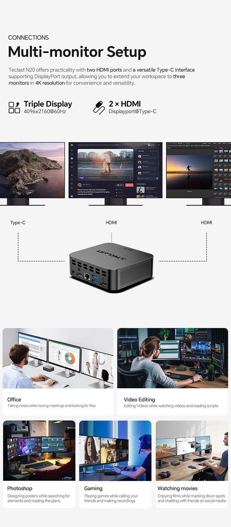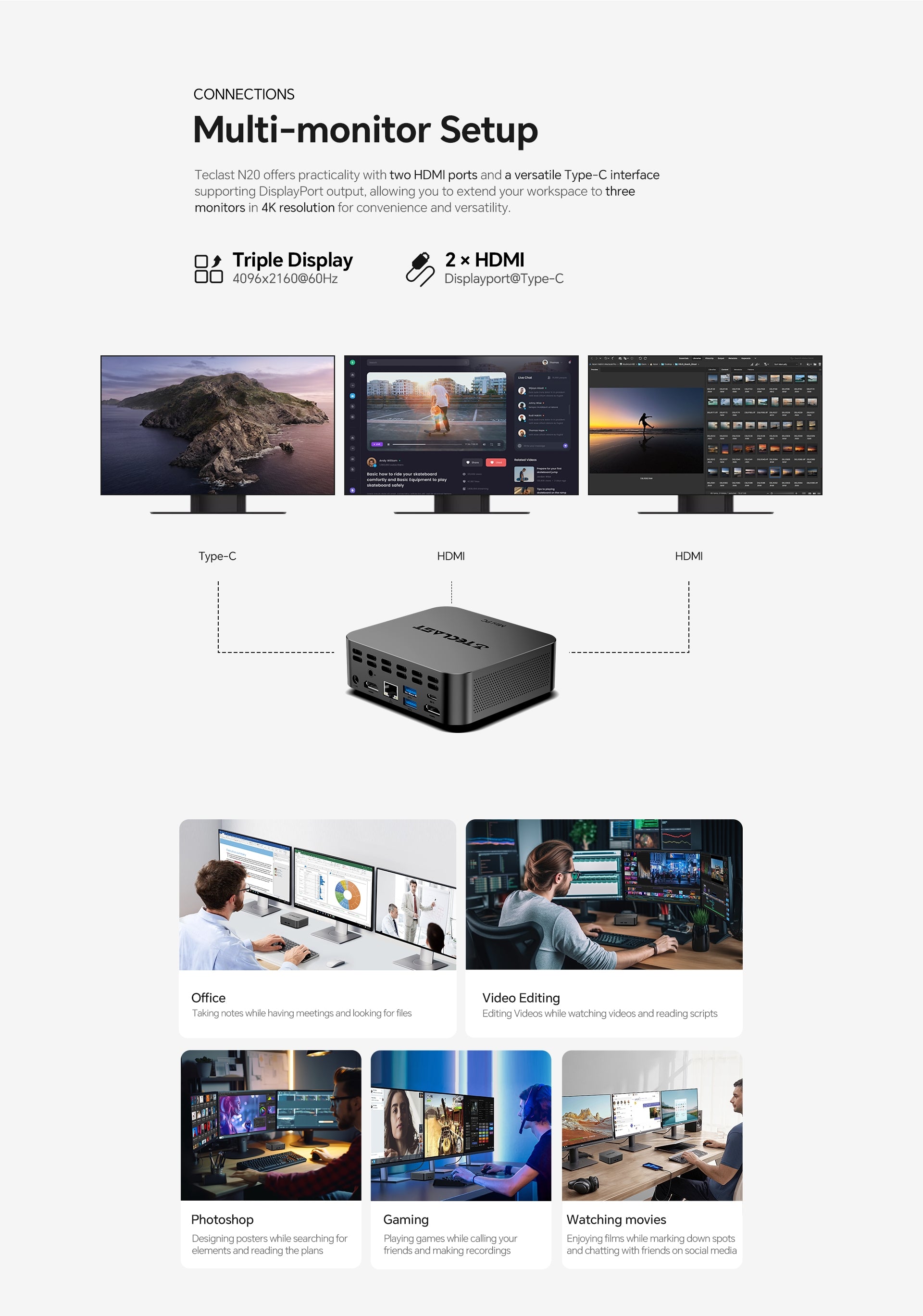 [การเชื่อมต่อที่ครอบคลุม] N20 มี HDMI คู่, พอร์ต Type-C ฟังก์ชันเต็มรูปแบบสำหรับจอแสดงผล 4K สามจอ และพอร์ต USB-A สี่พอร์ตสำหรับการเชื่อมต่อที่ครอบคลุม