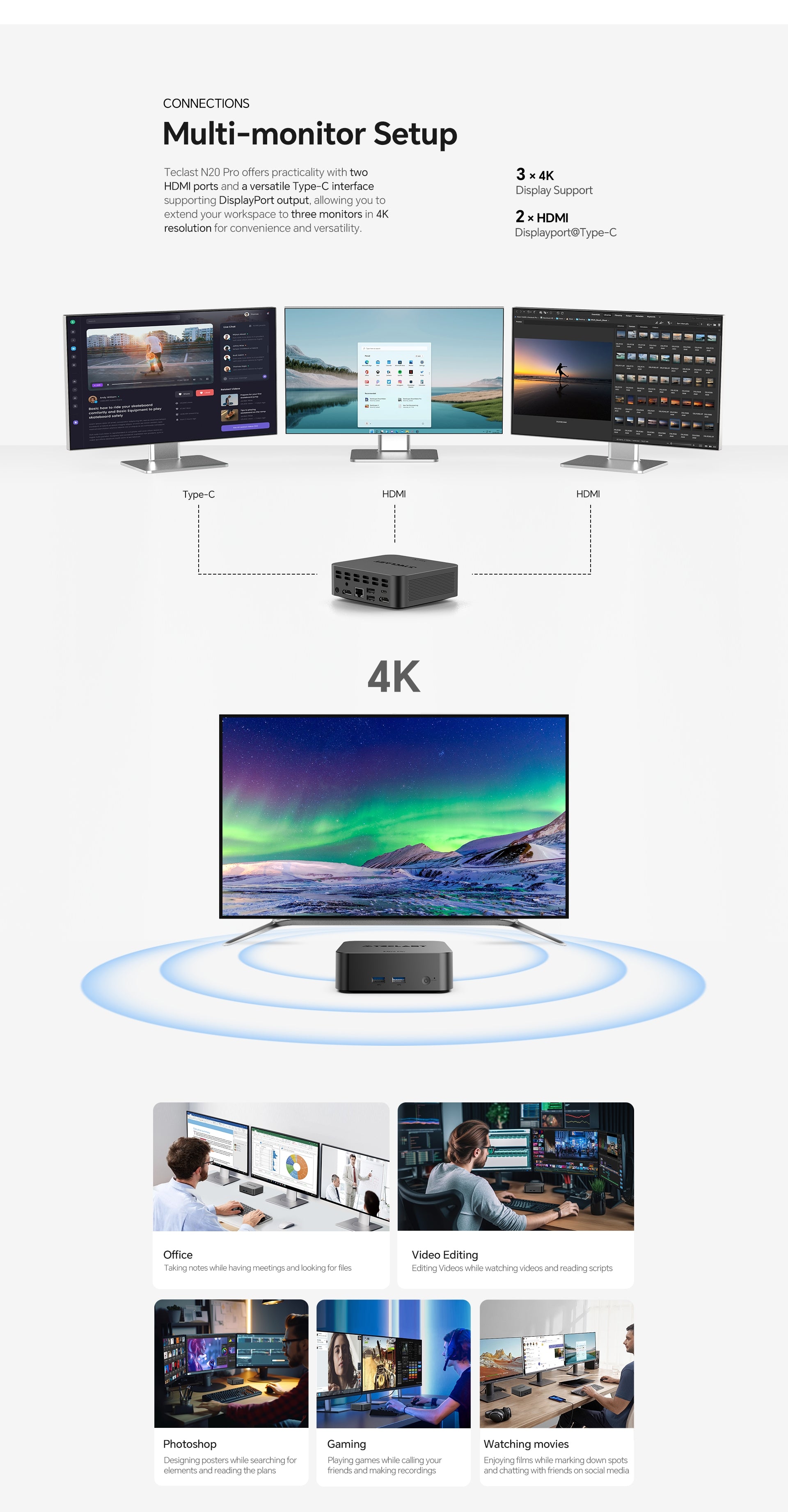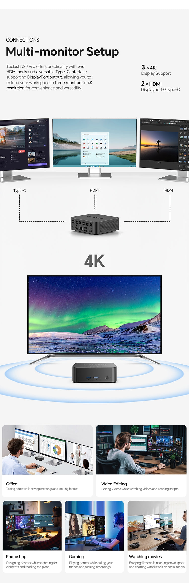 [การเชื่อมต่อที่ครอบคลุม] N20 Pro มี HDMI คู่, พอร์ต Type-C ฟังก์ชันเต็มรูปแบบสำหรับจอแสดงผล 4K สามจอ และพอร์ต USB-A สี่พอร์ตสำหรับการเชื่อมต่อที่ครอบคลุม