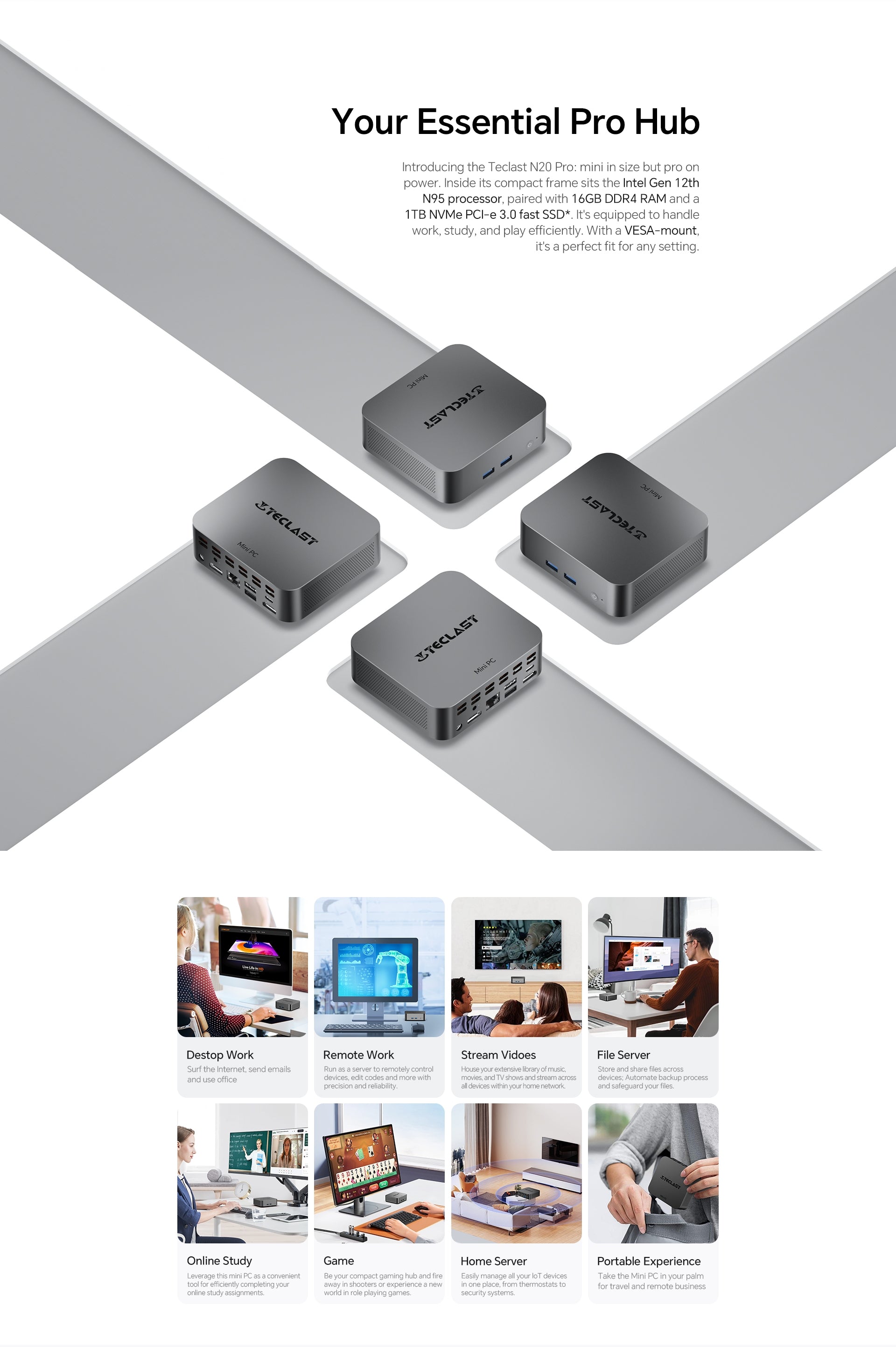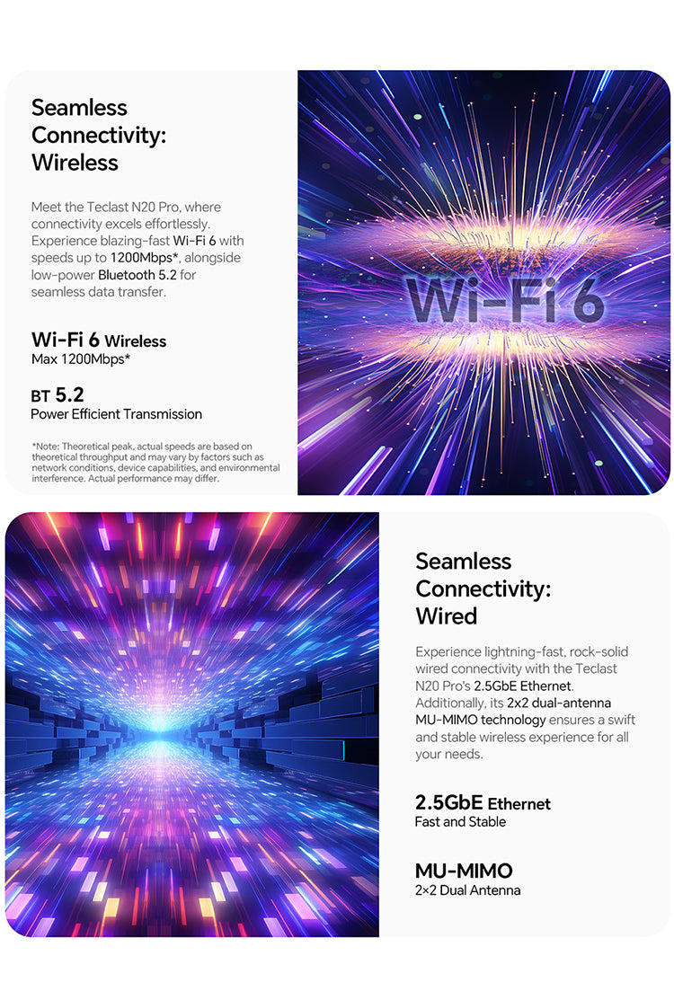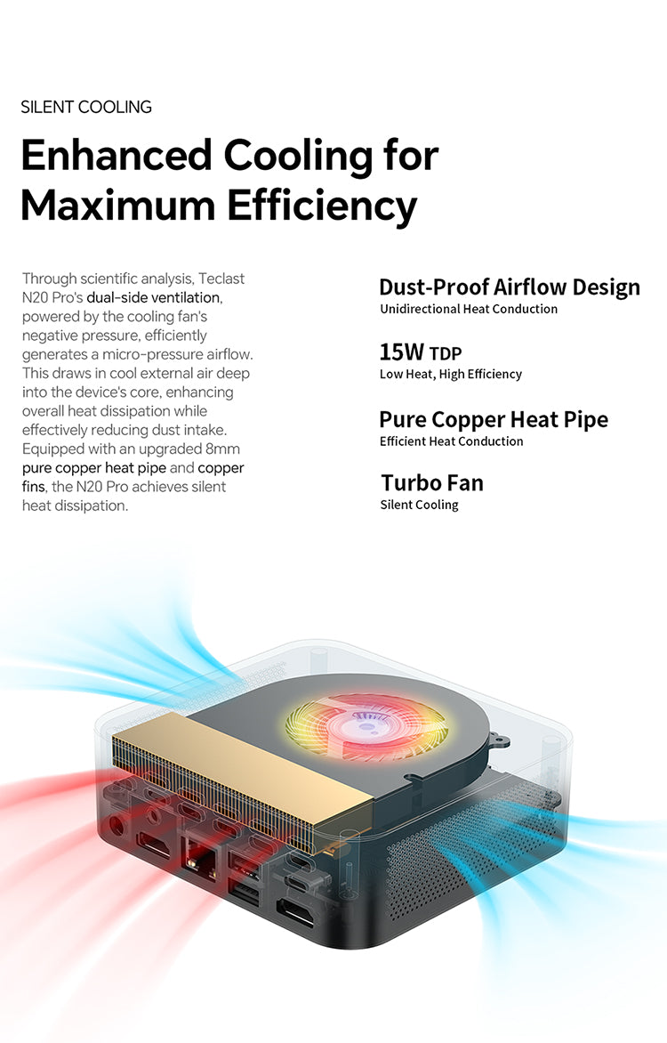 [CPU ประสิทธิภาพสูง] N20 Pro มีโปรเซสเซอร์ Intel N95 จากซีรีส์ Alder Lake รุ่นที่ 12 โดยมีการตั้งค่าแบบ Quad-Core สูงสุดที่ 34GHz เพื่อประสิทธิภาพที่เร็วขึ้น