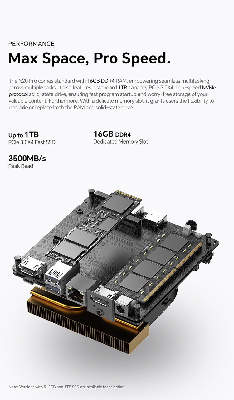 [พื้นที่จัดเก็บข้อมูลที่ขยายได้] ด้วย RAM DDR4 ขนาด 16GB และ NVMe SSD สูงสุด 1TB N20 Pro มอบพื้นที่จัดเก็บข้อมูลความเร็วสูง อัปเกรดได้เพื่อประสิทธิภาพที่ดียิ่งขึ้น