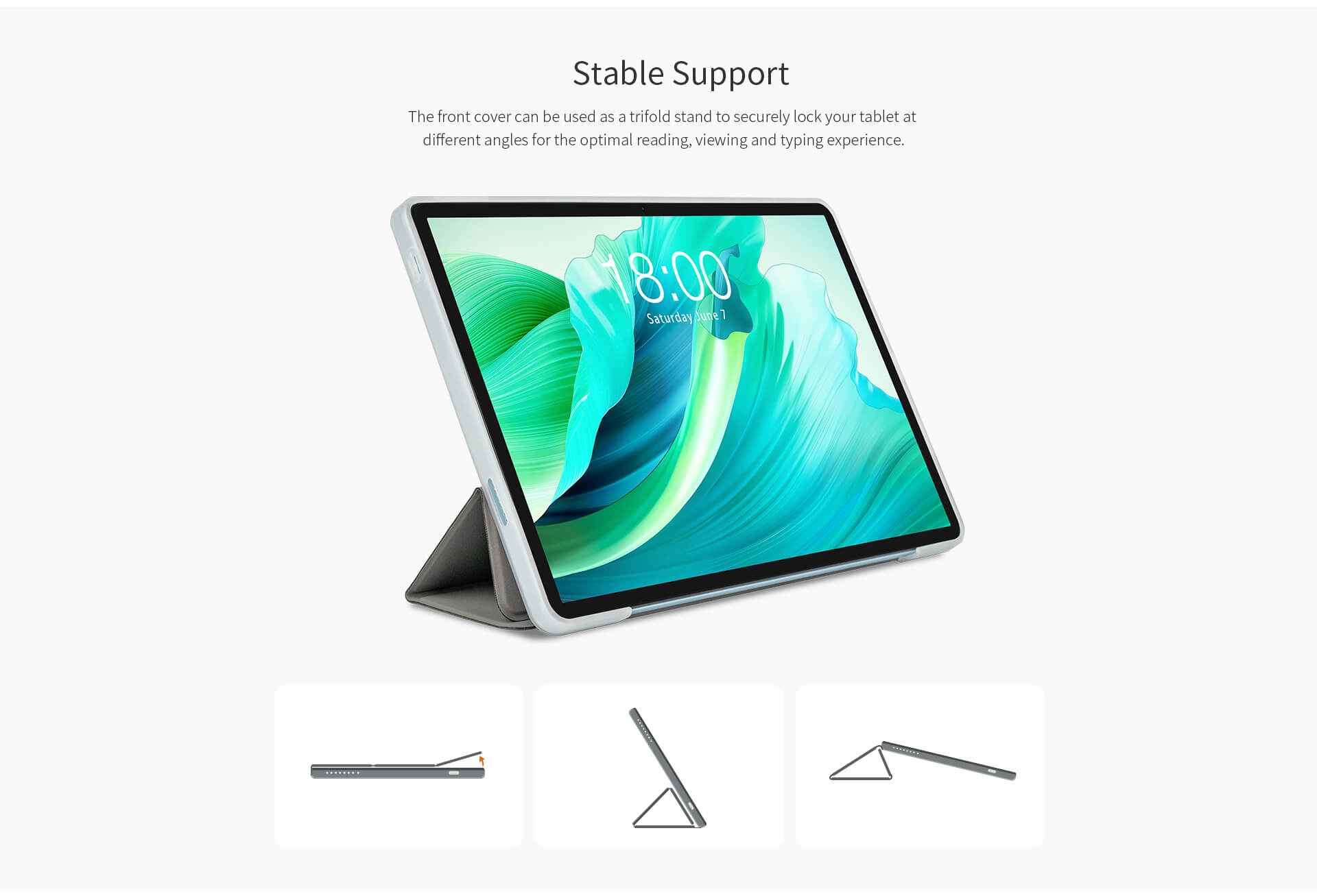 The front cover can be used as a trifold stand to securely lock your tablet at different angles for the optimal reading, viewing, and typing experience.
