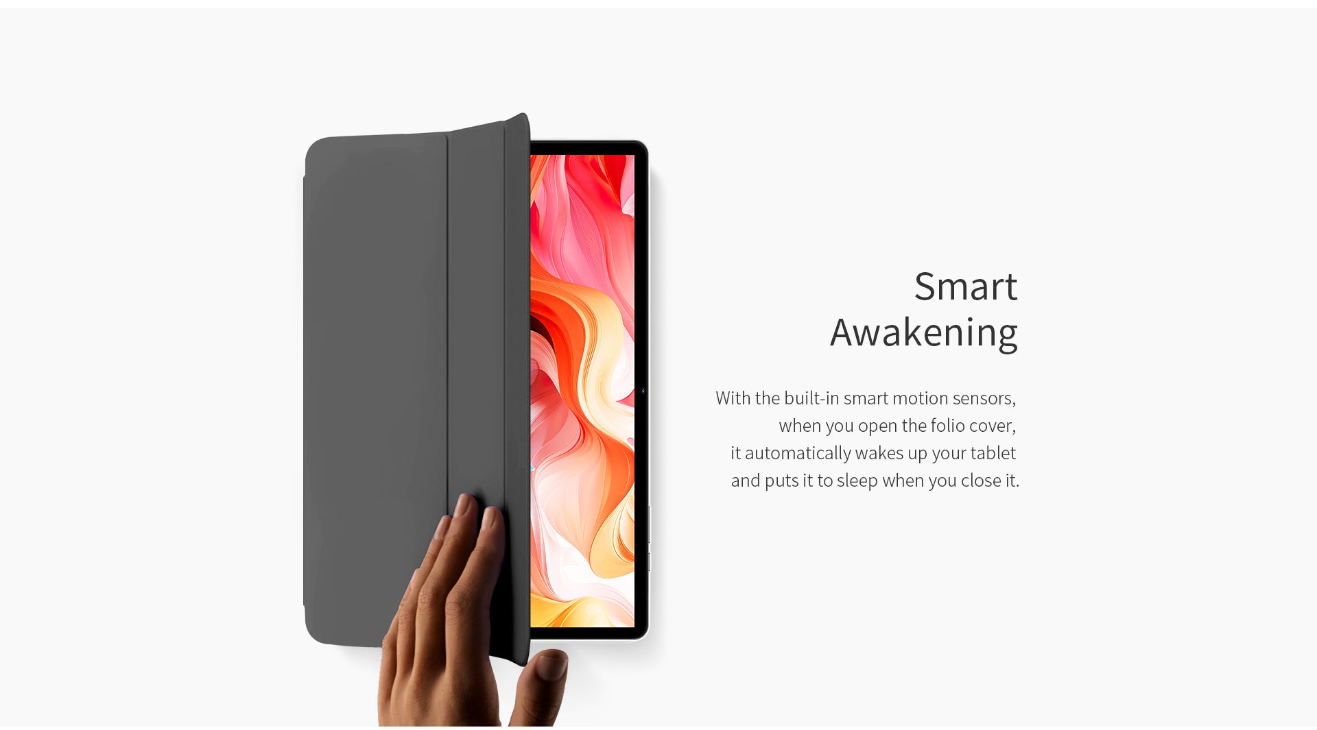 ด้วยเซ็นเซอร์ตรวจจับความเคลื่อนไหวอัจฉริยะในตัว เมื่อคุณเปิดฝาครอบ Folio แท็บเล็ตจะปลุกแท็บเล็ตของคุณโดยอัตโนมัติและสั่งให้เข้าสู่โหมดสลีปเมื่อคุณปิด