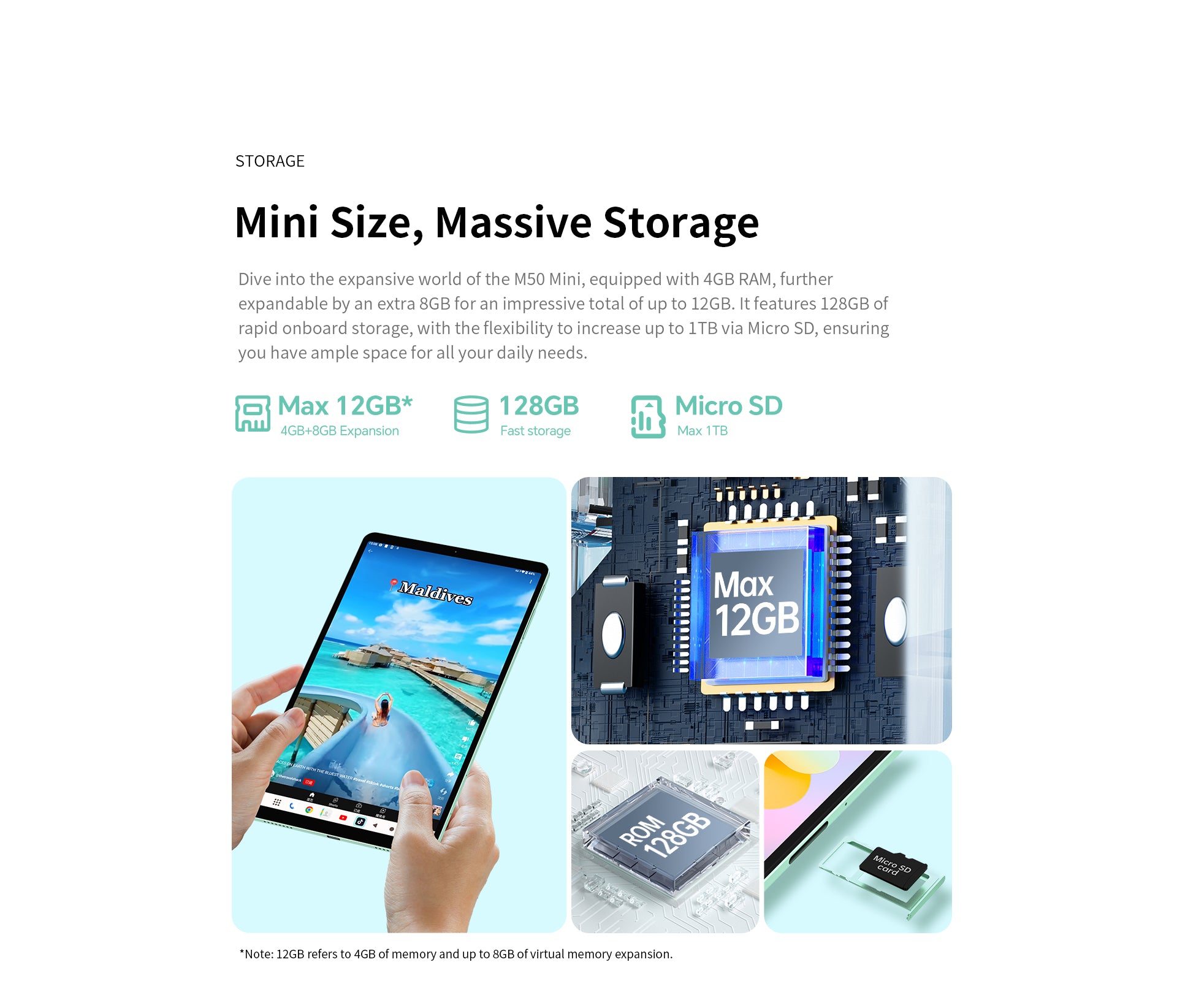 [Expanded Memory and Storage] With 4GB of RAM and an additional 8GB of expandable virtual RAM, the M50 Mini WiFi handles multitasking effortlessly. It also offers 128GB of internal storage, providing plenty of space for all your apps, media, and documents.