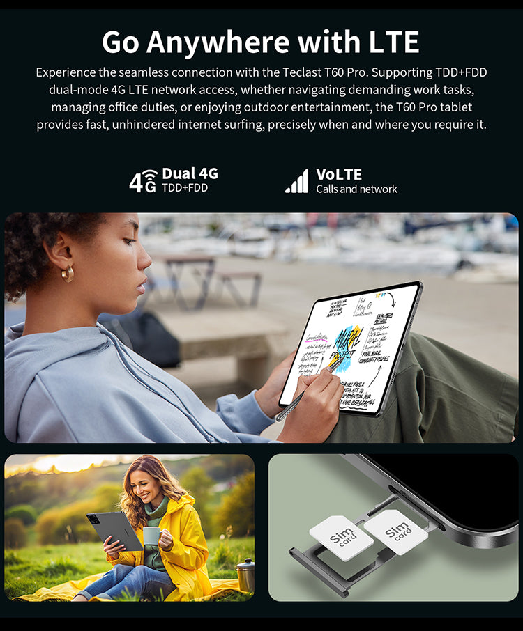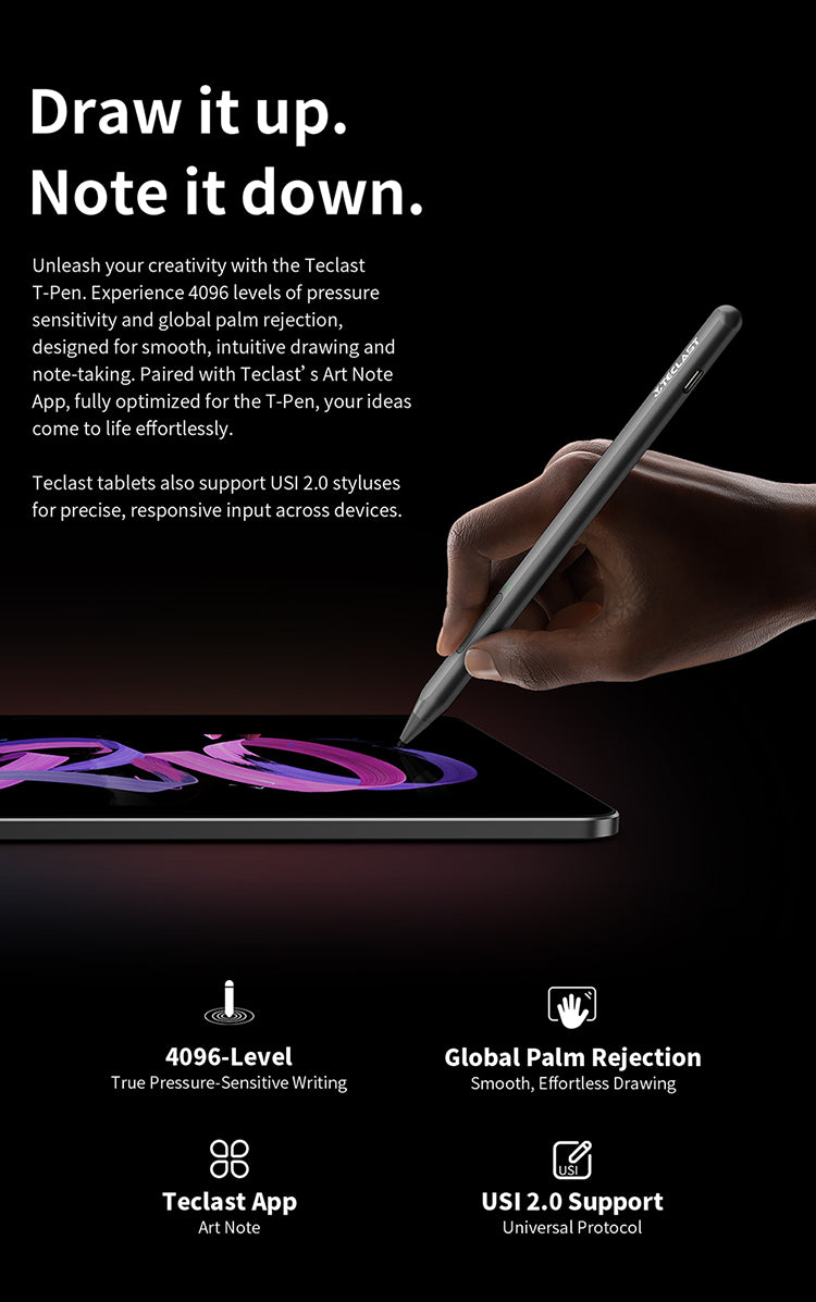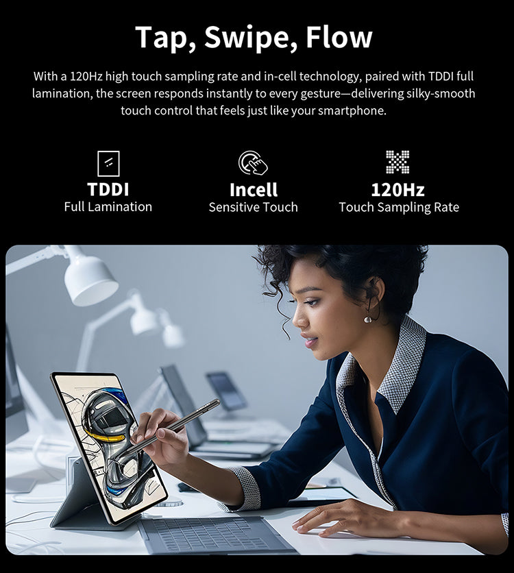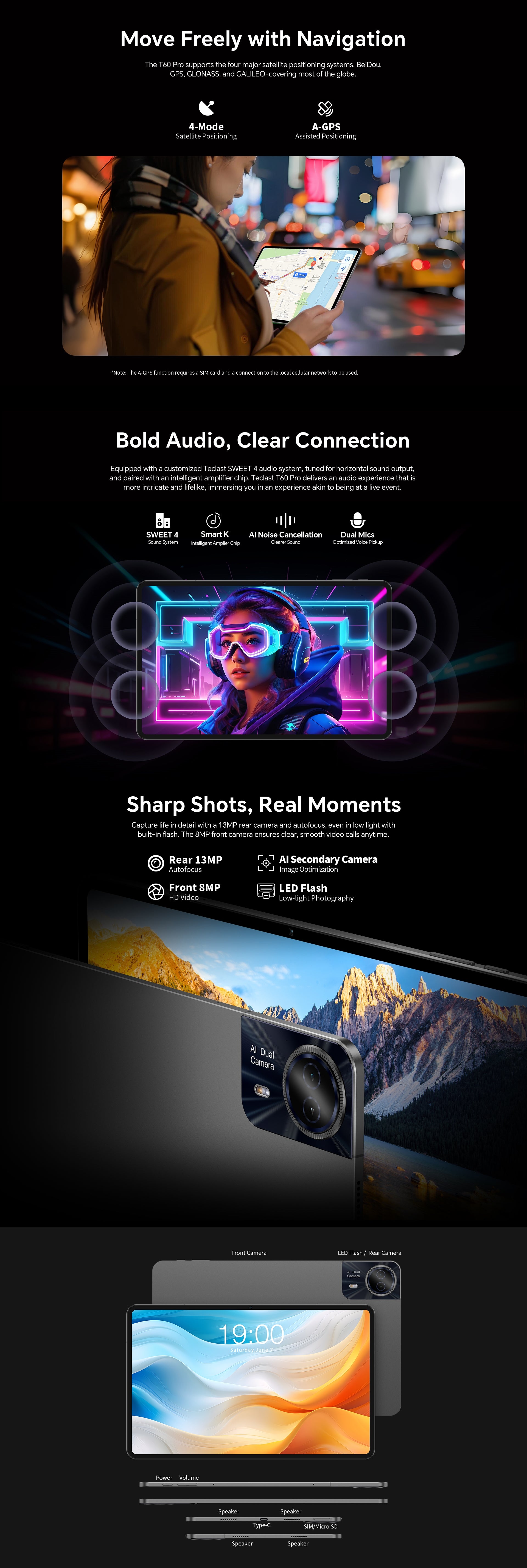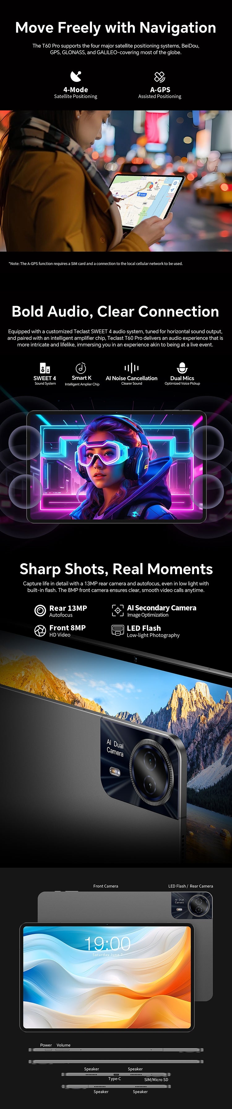 [12英寸视觉盛宴] T60 Pro配备12英寸IPS屏幕,拥有2000×1200分辨率与16:10屏幕比例,搭配T-Color 6.0色彩优化技术,呈现鲜活逼真的色彩,无论是办公还是娱乐,视觉体验都十分出色。