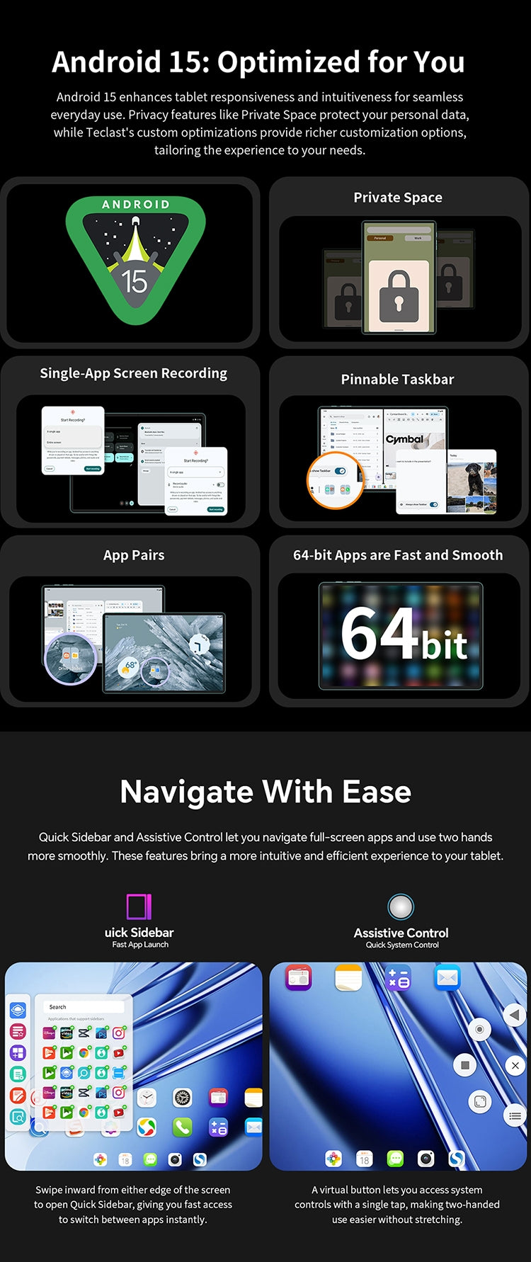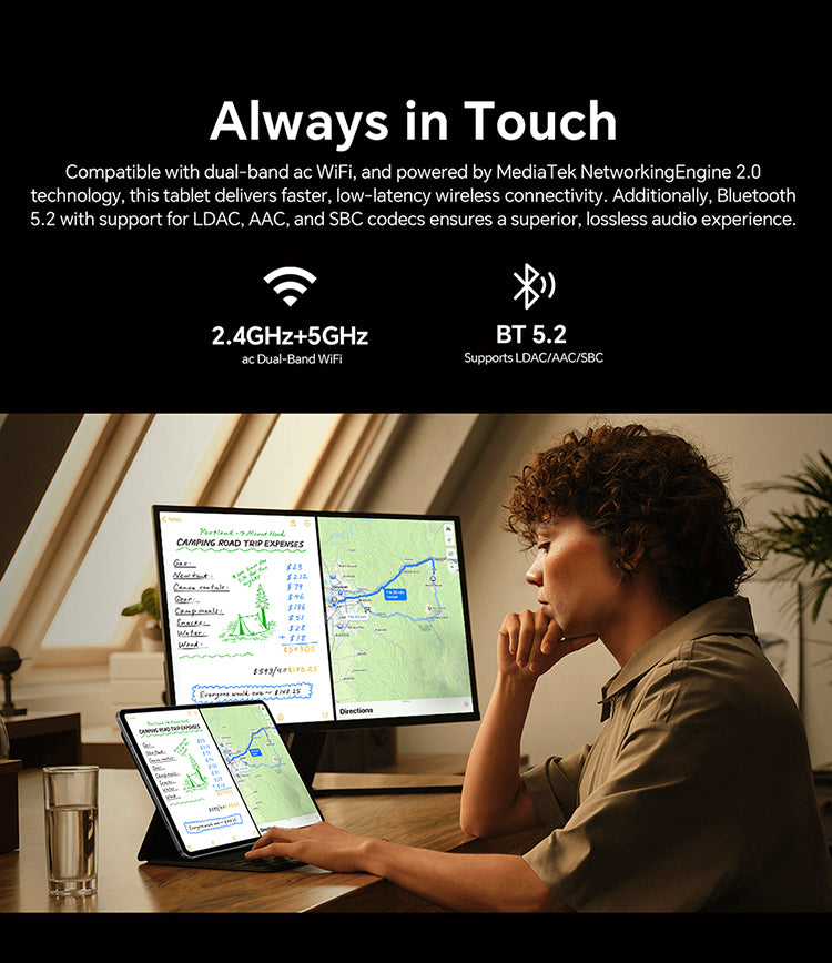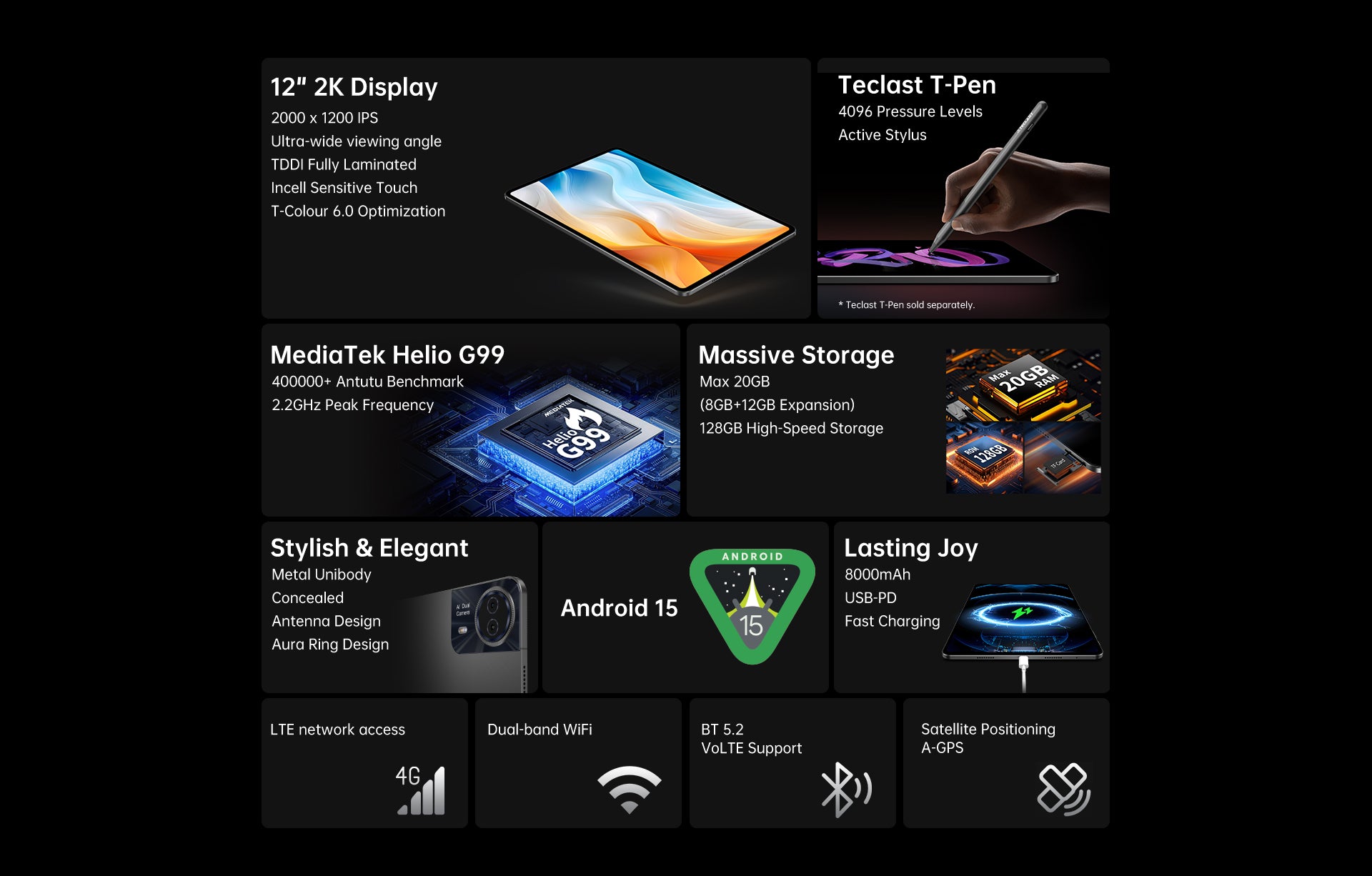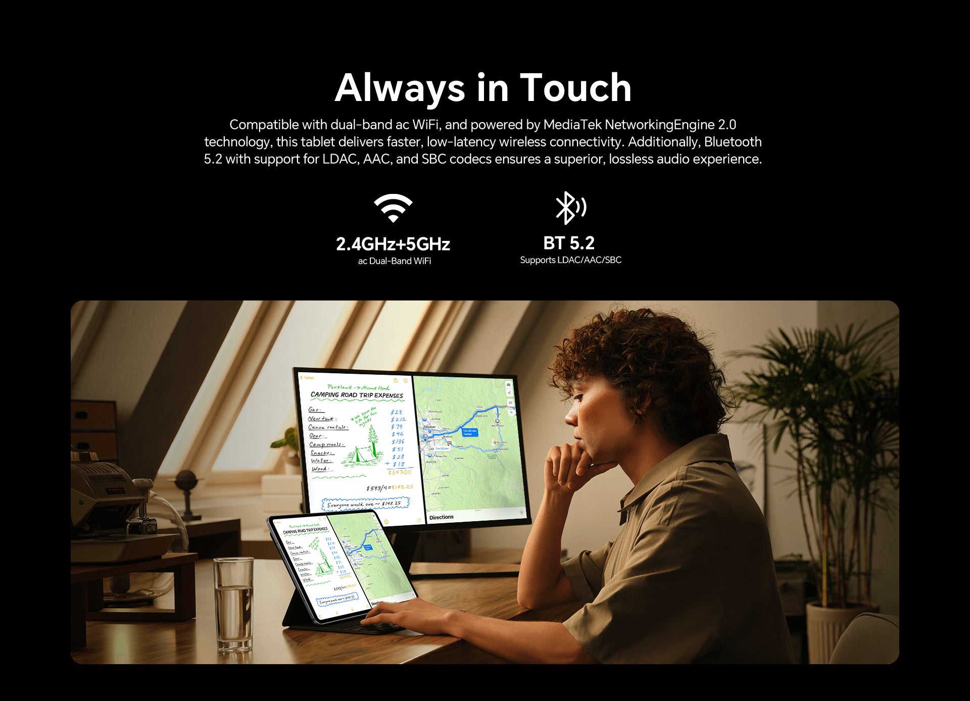 [12英寸视觉盛宴] T60 Pro配备12英寸IPS屏幕,拥有2000×1200分辨率与16:10屏幕比例,搭配T-Color 6.0色彩优化技术,呈现鲜活逼真的色彩,无论是办公还是娱乐,视觉体验都十分出色。