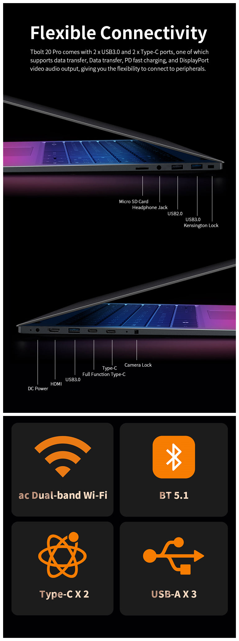 2xType-C(1x全功能)、2xUSB 3.0、1xUSB 2.0、Kensington Lock